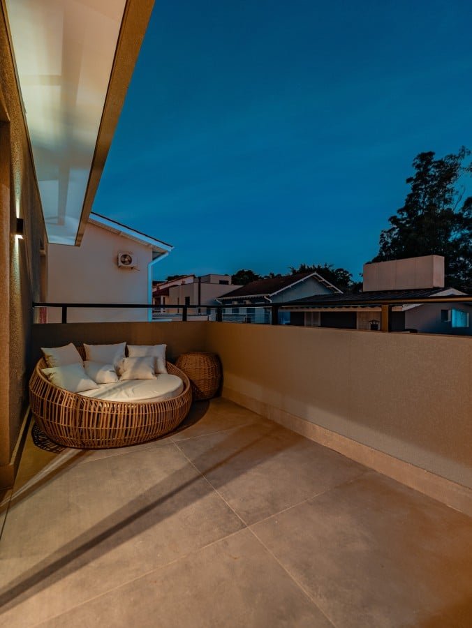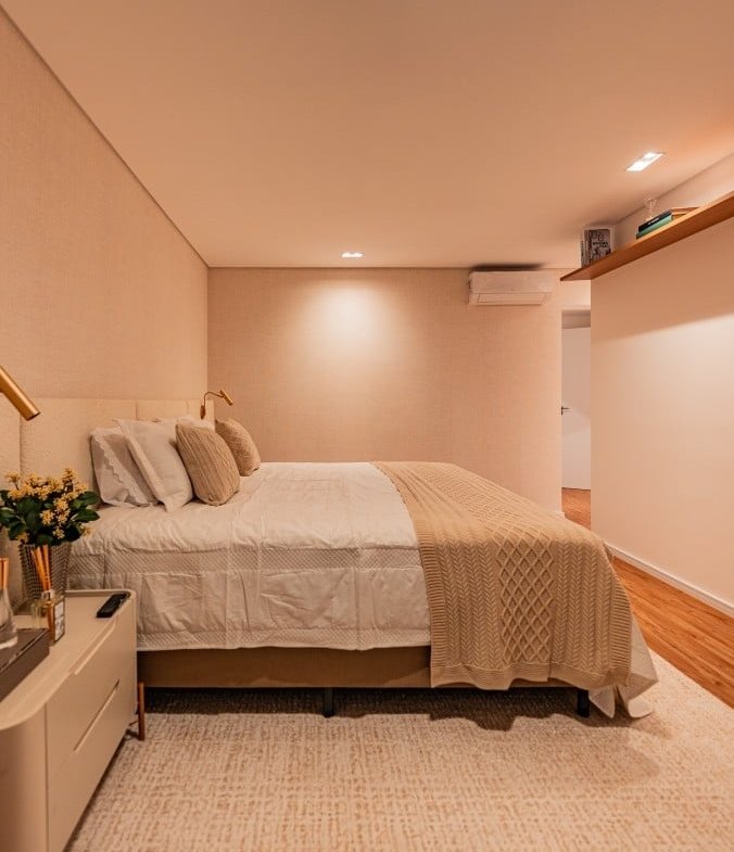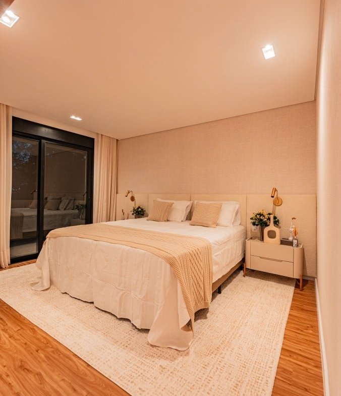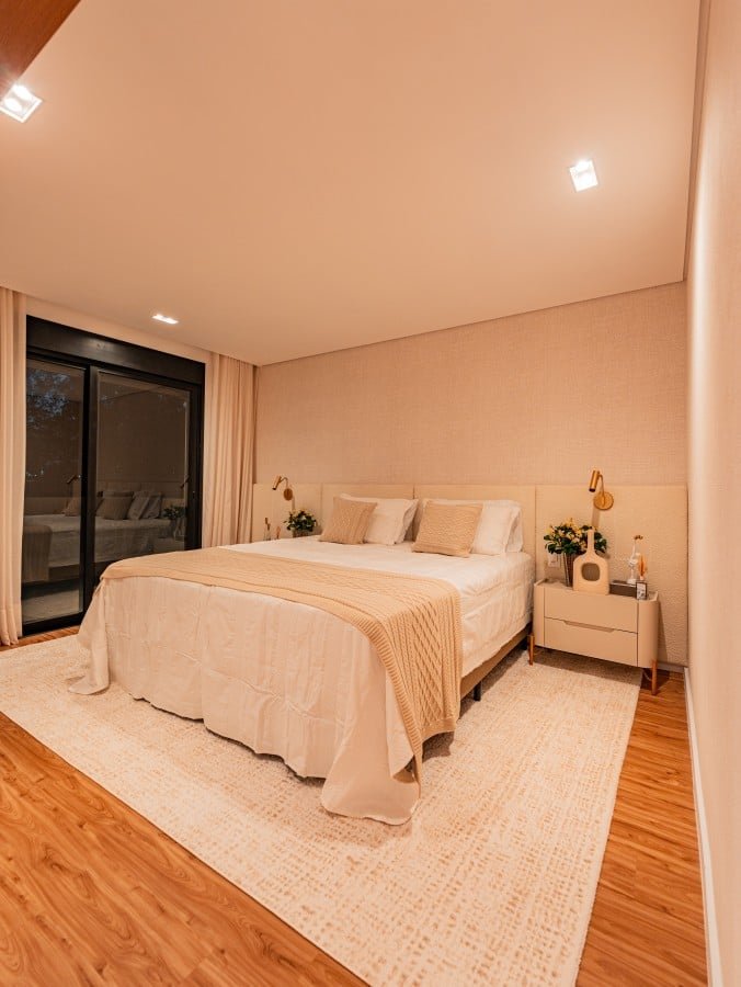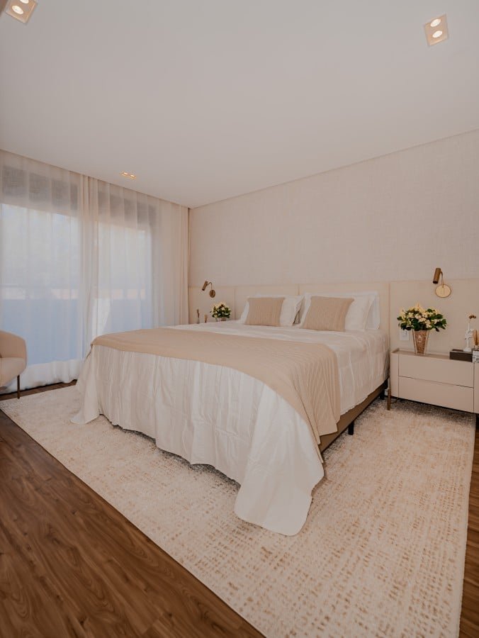 - 4 suítes, sendo uma térrea reversível para escritório, umasuíte máster (com terraço, closet amplo, banheiro com duas cubas, ducha dupla). Todas equipada com persianas blackout automatizadas através de controle remoto e ar condicionado