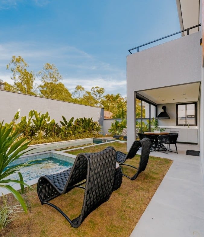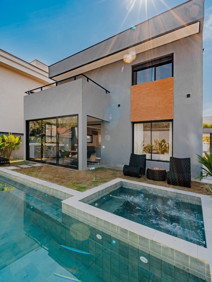 Residência unifamiliar de alto padrão, com arquitetura contemporânea, construída em terreno plano, comprojeto paisagístico, iluminação externa e fachada com acabamento em textura projetada com pintura Decor Colors Borracha Líquida flexível e detalhes em revestimento tipo Revestimento Brick Natural Tijolinho Plaqueta Terracota. Telhado embutido e esquadrias em alumínio preto.