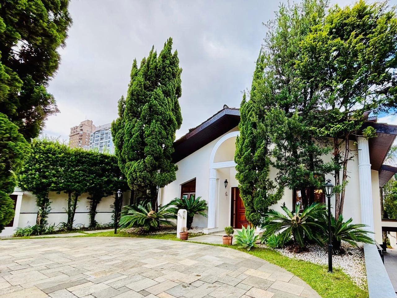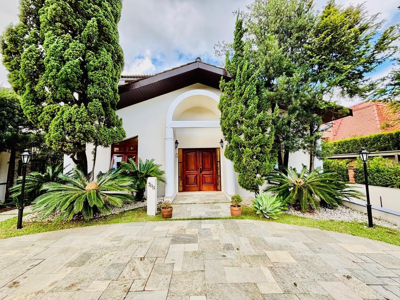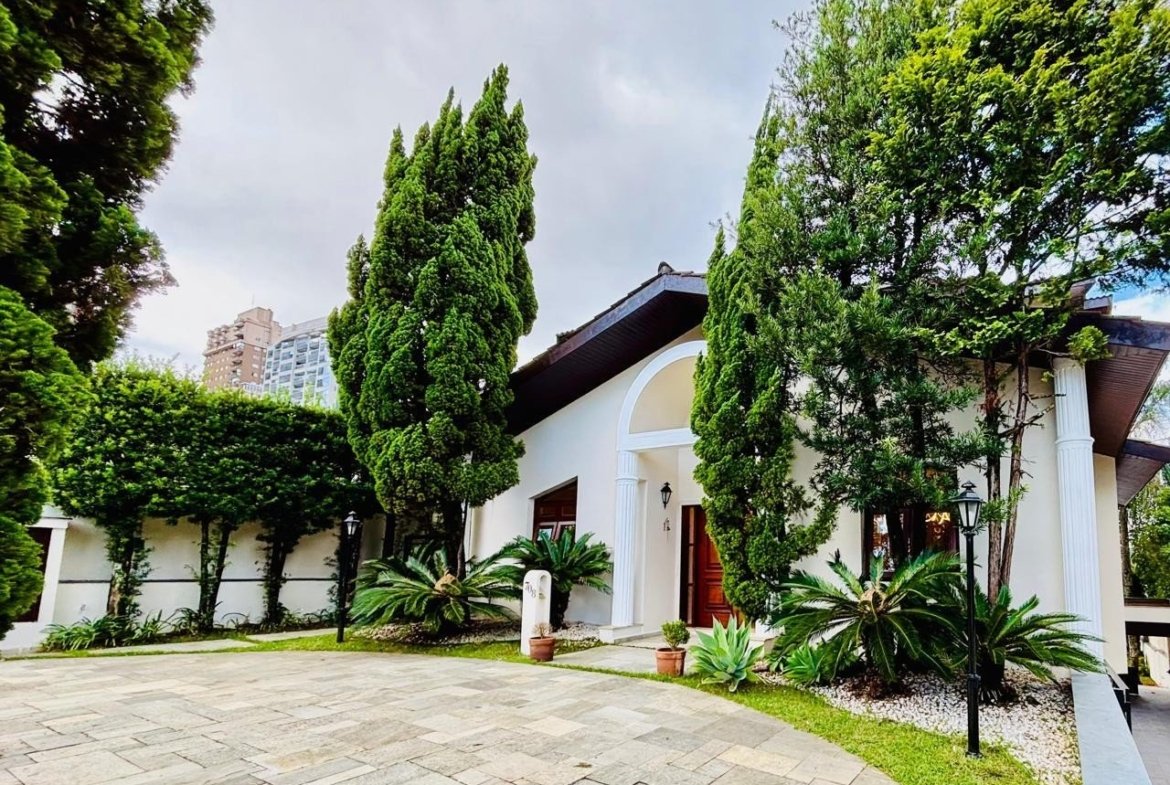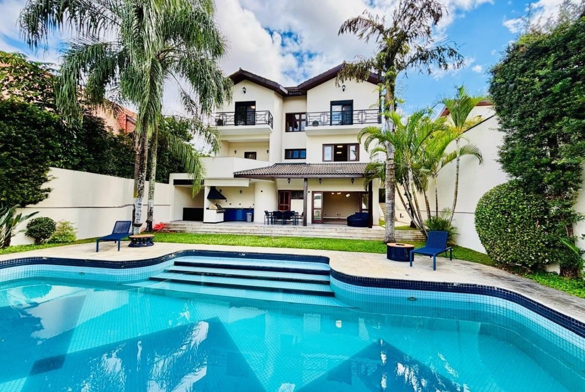 A casa tem escritório com entrada independente e ar-condicionado, salão de festas com banheiro, área gourmet integrada e churrasqueira + cooktop a gás, 4 suítes sendo uma suíte master com closet e hidromassagem, todas com varanda e ar-condicionado, armários + guarda-roupas embutidos, cozinha, dispensa, lavanderia, dormitório e WC de empregada, piscina com 13 metros, garagem coberta para 3 carros e descoberta para mais 3 carros, casa semi-mobiliada e em ótimo estado de conservação.